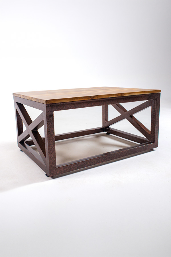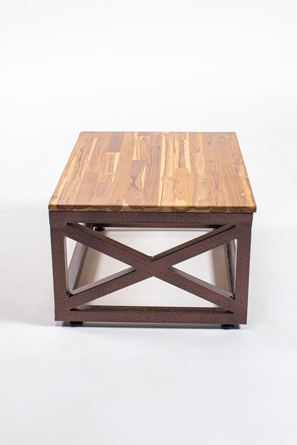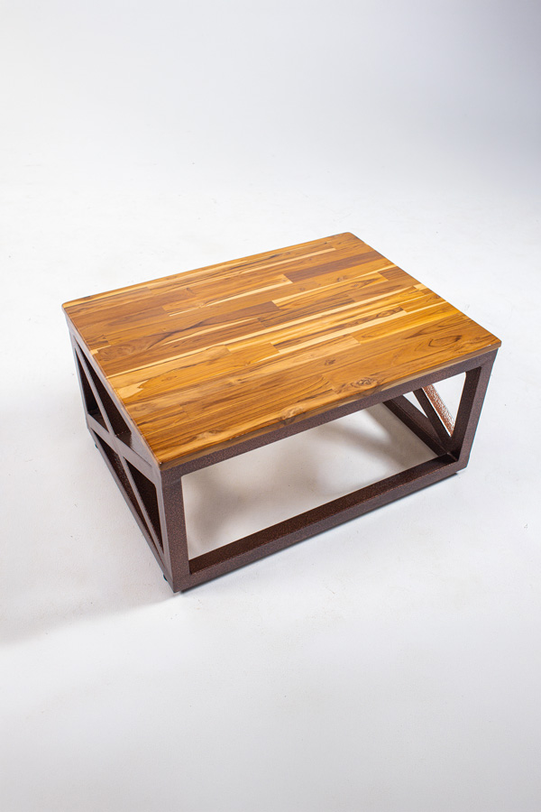 Tablero de madera maciza y base de fundición de hierro en tubo cuadrado de acero.
